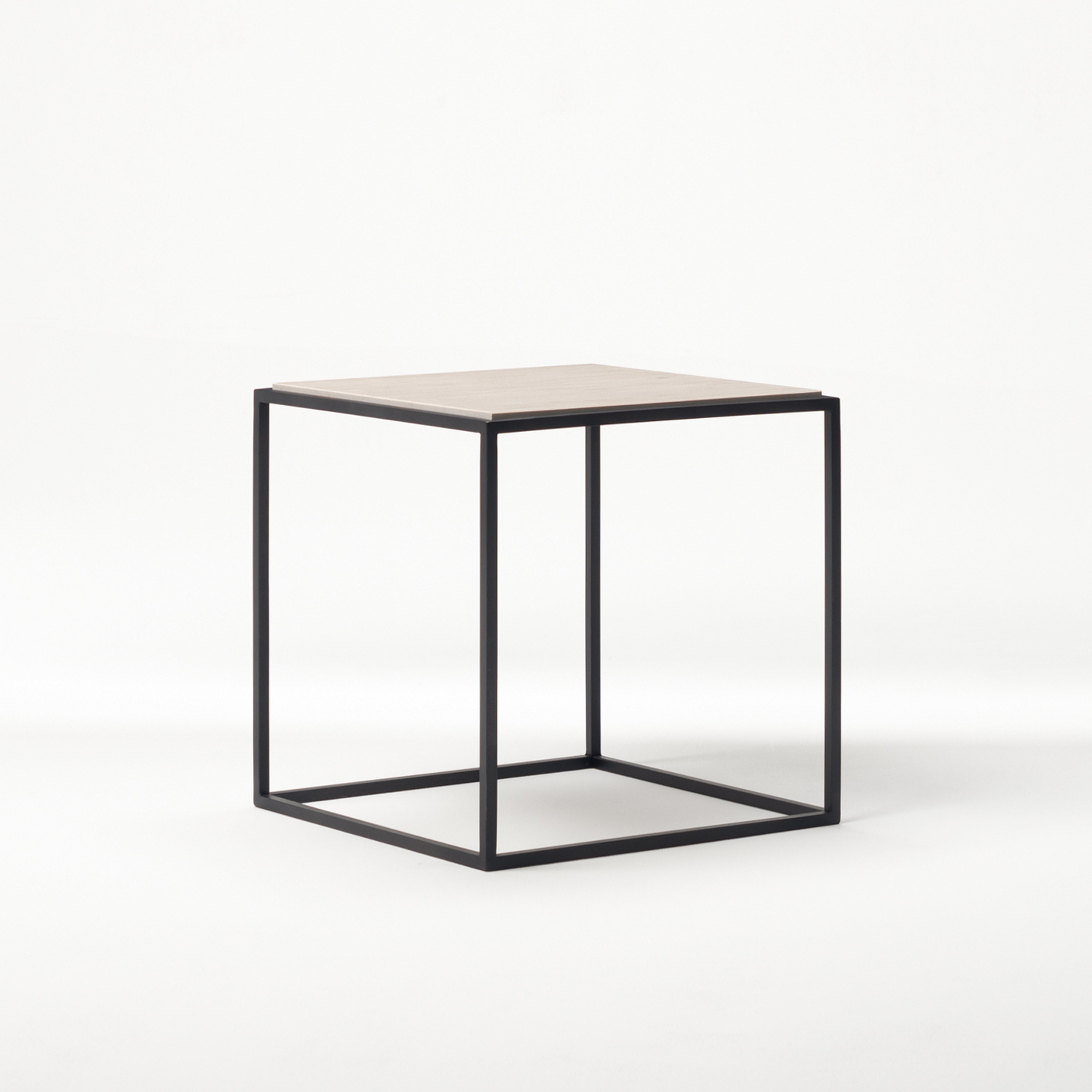 13mm角のスチールロッドとライムストーンのみのサイドテーブル。天板はライムストーン水磨き。脚部は黒皮スチールロッド クリアウレタン仕上げ。