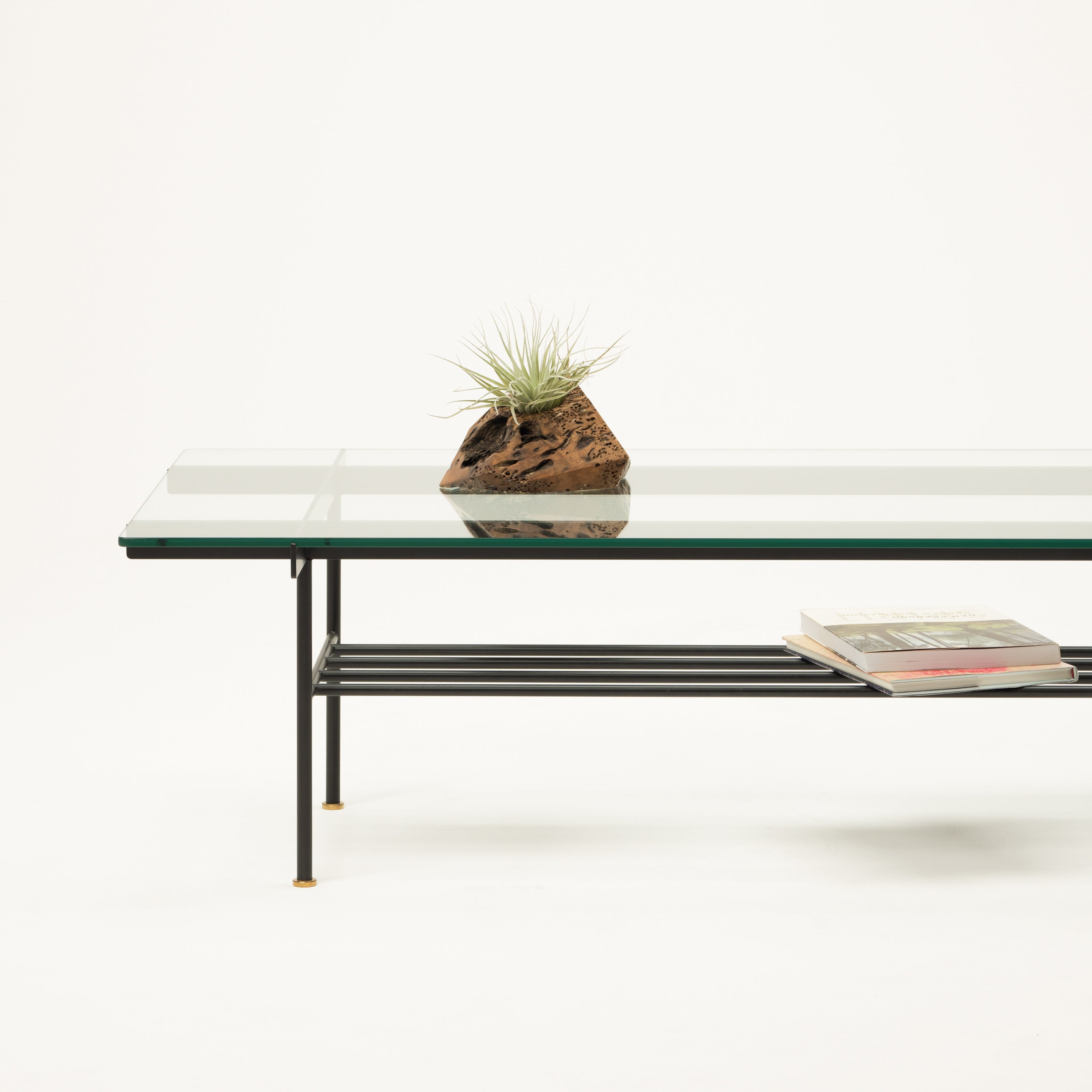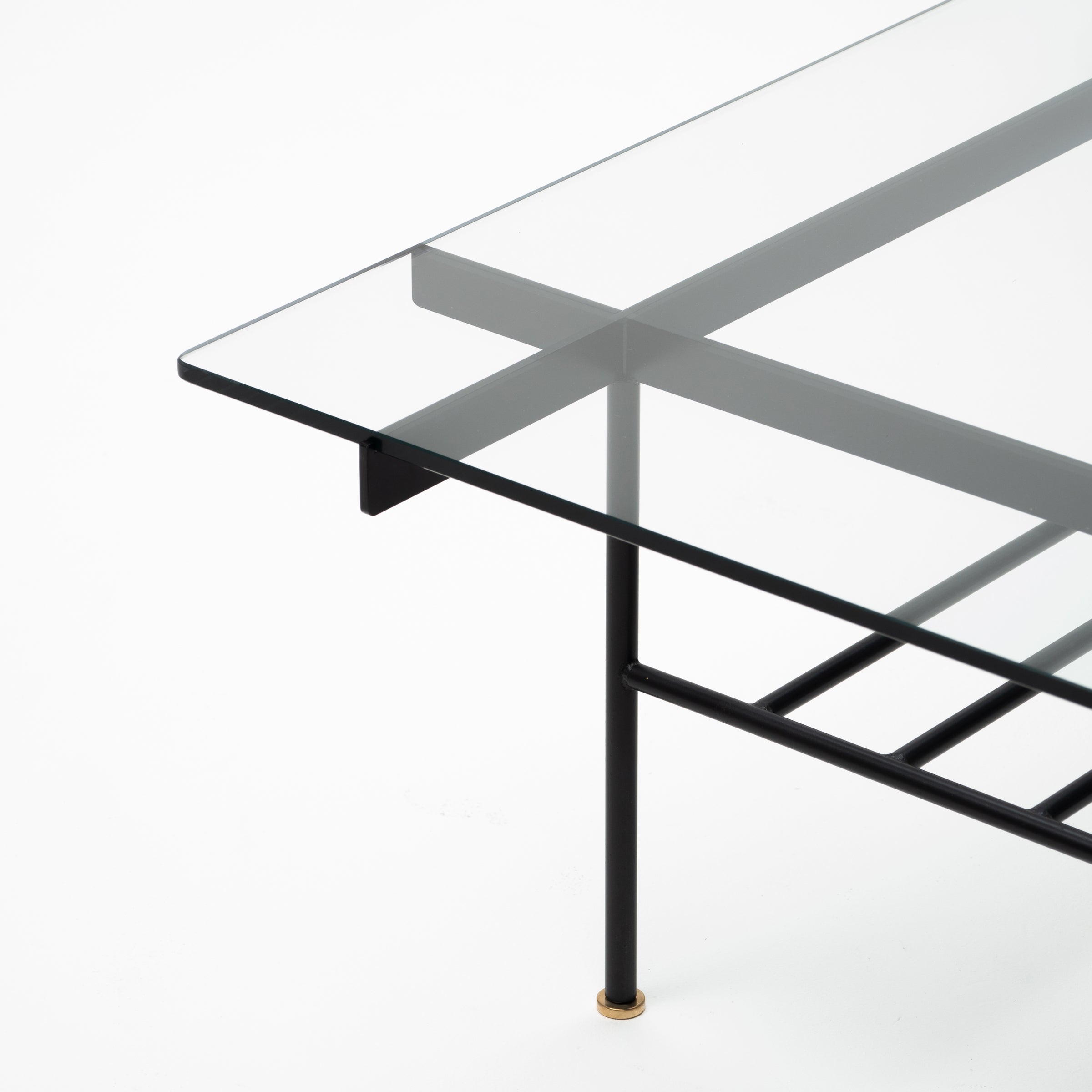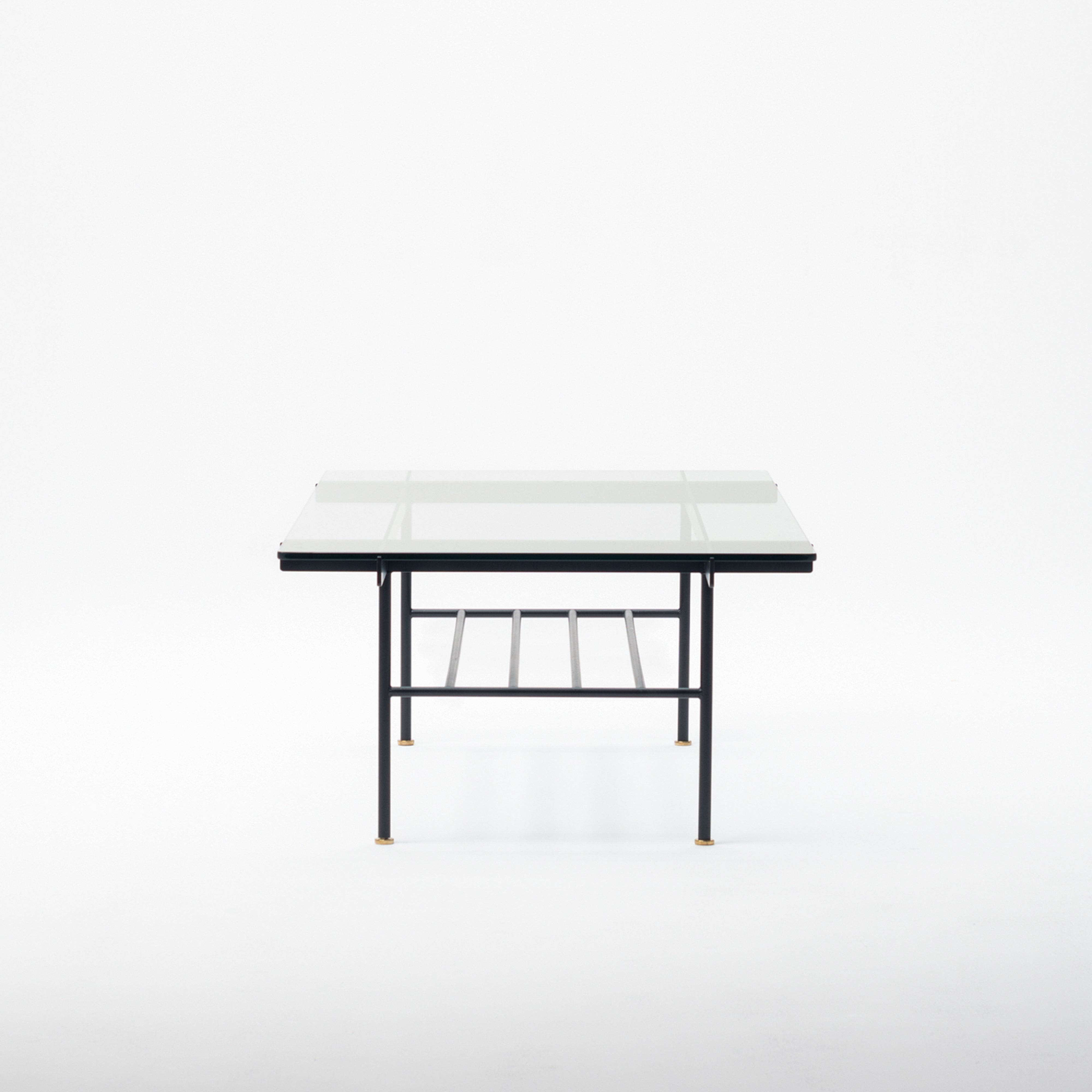 カテドラルはフランス語で、大聖堂の意味。FL10mmのクリアガラスからスチールフレームの構造が見え、中棚にディスプレイされたアイテムが見える事を主眼に置いてデザインしたローテーブル。