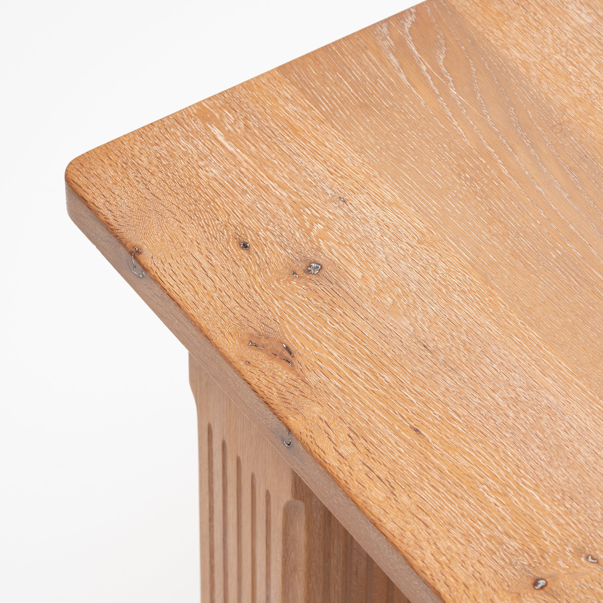 このテーブルは、北米原産のFSC認証を受けたホワイトオークの材No.1コモン材(節あり材)40mm板を使用し、天板厚32mmで全て板目でランダム巾で接ぎました。脚部は115mmの太さで間口方向から見た際には板目になる様に脚部を製作し、掘り込みは6mm巾のルーターを5本入れ、接合部には木栓を使用してポイントを付けております。イギリスでは正統派のアンティークテーブルのデザインに乾燥しきったホワイトオークを使って製作したテイストを出すために白のワイピング塗装(拭き取り塗装)を施し、シンプルでありながら、飽きることのない不変的で重厚なテーブルを目指して製品化しました。