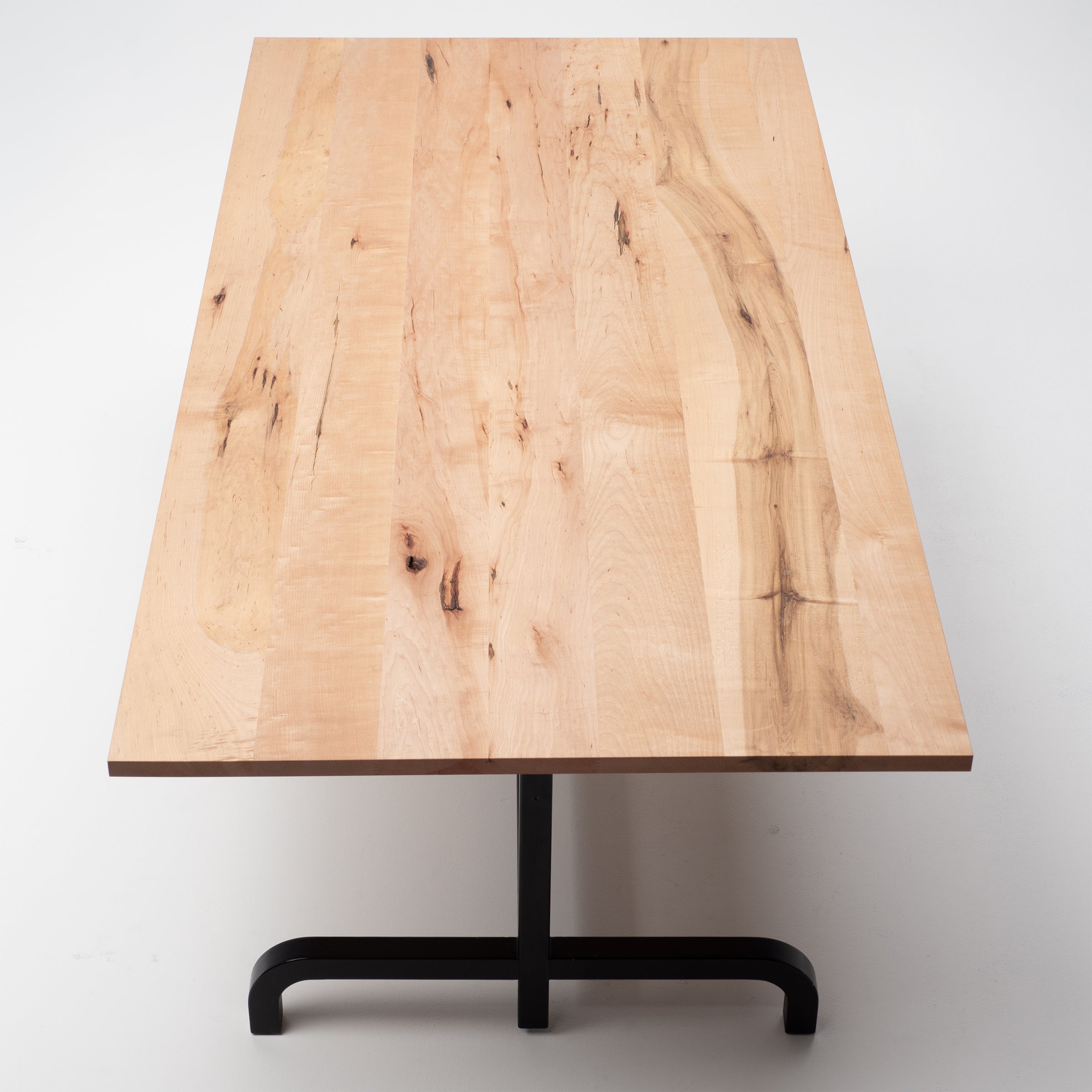 1920年代のテーラーが使っていた作業台をモチーフにハンドルを回す事によってラック アンド ピニオン ギアを介し天板が昇降する機構。天板は現在伐採禁止となってしまった北海道産のスポルテッドメープル(樹皮の亀裂から雨水が浸み込み、細菌が繁殖してできた杢のメープル)オイル仕上げ。メープルは経年変化で飴色に変化し、味わいが増してきます。脚部はスチール刷毛塗り塗装。